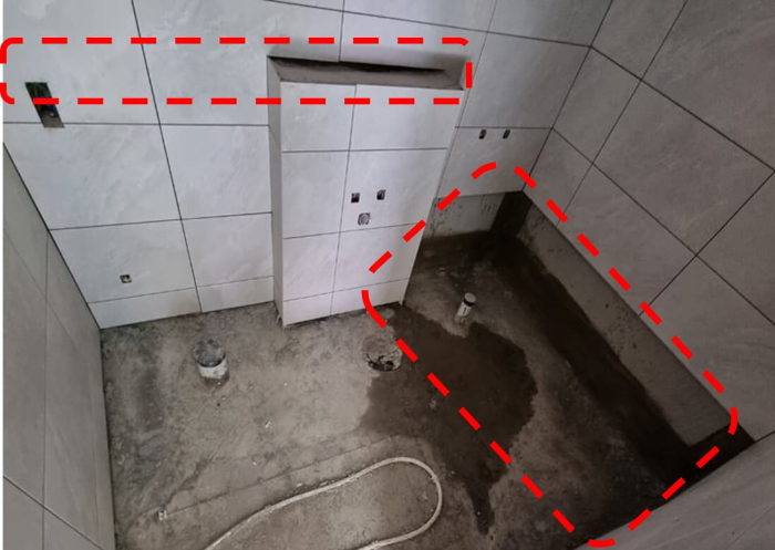위의 사진에서 보시는 바와 같이 젠다이 밑면과 욕조 뒷면에는 타일마감이 없으므로 코킹을 미시공하여 물의 유입이 발생한다면 자칫 방수하자로 발전할 수 있습니다. 따라서 코킹을 반드시 시공해야 하는 부분이며, 세면대 뒷면은 타일시공이 되어 있기 때문에 물의 유입에도 하자의 우려는 없습니다.